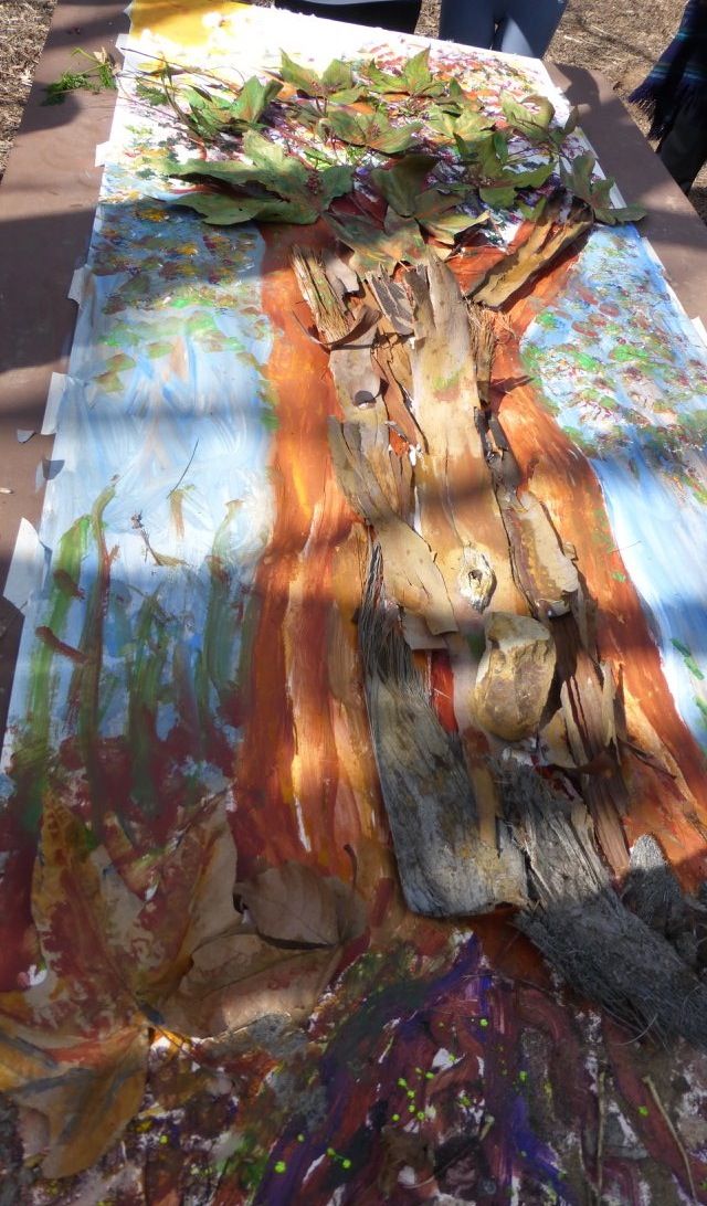 Other practices over the duration of the training add to my list of interventions that combine expressive arts and ecotherapy. The first weekend, we created a tree together as a group; first in an embodied way, as some of us represented roots, others the trunk, the phloem and stomata (which help the flow of water and nutrients in the tree) and the leaves, as we incorporated the teachings of the intricate nutritional exchange system.Next,we collected natural material from the woods (bark, dirt, dried leaves, sticks, etc.), and with paint created a large tree together as our first group art project, which has since been hung in exhibition at Sky Mountain Institute.